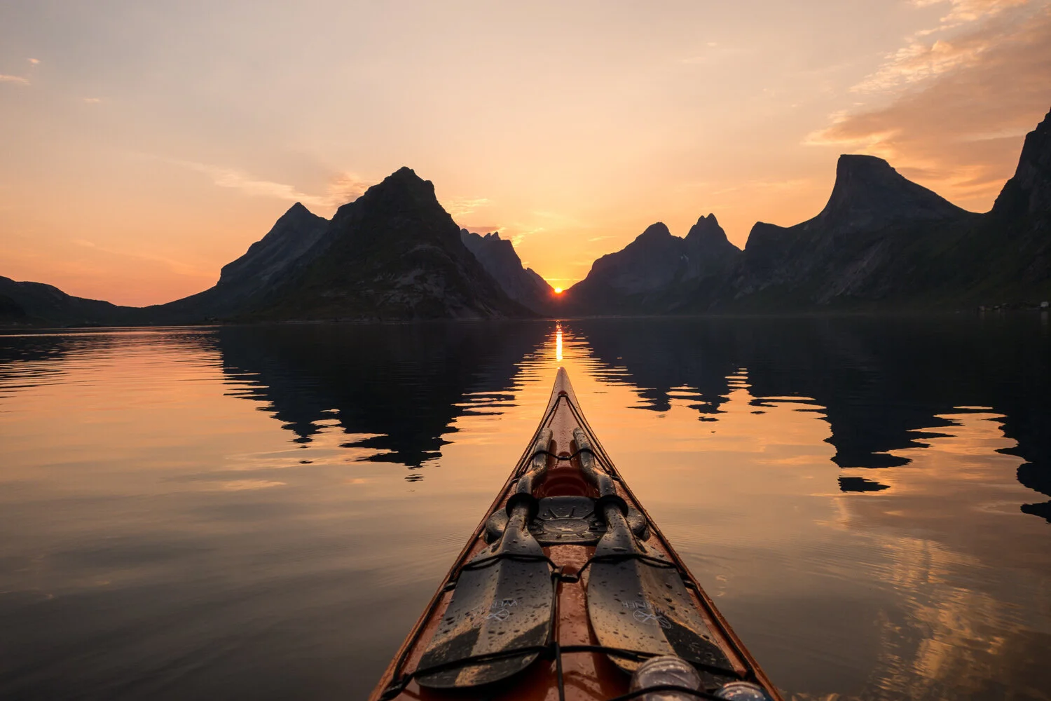Ein besonderes Erlebnis, das man so nur in den skandinavischen Ländern erleben kann, ist das Kayakfahren in der Mitternachtssonne. Wenn die Sonne am Abend nicht unterzugehen scheint und das Licht die norwegische Landschaft in goldene Farben taucht, wird das Paddeln auf dem Fjord in einer stillen Atmosphäre zu einem unvergesslichen Abenteuer. Erleben kann man dies beispielsweise an der Küste Helgelands in Engavågen oder auf den Lofoten.
